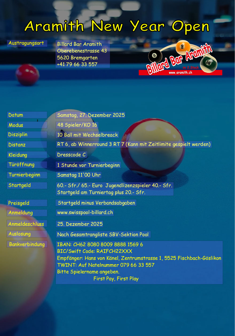 Samstag, 27. Dezember 2025Aramith New Year OpenBillard Bar Aramith, Bremgarten |