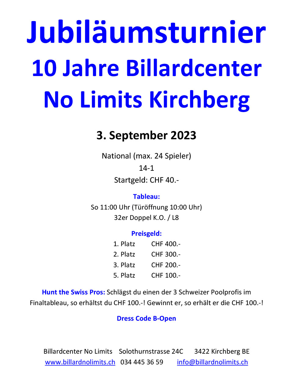 Sonntag, 03. September 2023No Limits Open - 14-1Billardcenter No Limits, Kirchberg |