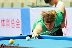 Gestern Freitag durfte Claudia wie erwähnt gegen die Japanerin, Yukawa Keiko spielen. Das Spiel begann mit einem Break der Japanerin und sofort stand es 0:1. Danach breakte Claudia und da sie kein Risiko eingehen wollte spielte sie Save. Dieser kam leider nicht gut und somit hiess es 0:2. Die nächsten 2 Punkte konnte sie für sich verbuchen (mit einer 9 über Bande), Score 2:2. Keiko liess sich aber dadurch überhaupt nicht verunsichern und räumte die nächsten 2 Tische ab, 2:4. Bei diesem Stand verschoss sie die acht. Claudia lochte diese aber die Position auf 9 war nicht optimal und prombt klapperte diese im Loch. Somit 2:5 und nach erneutem durchspielen der Japanerin 2:6. Claudia konnte noch auf 3:6 verkürzen ehe sie 3:7 verlor.
