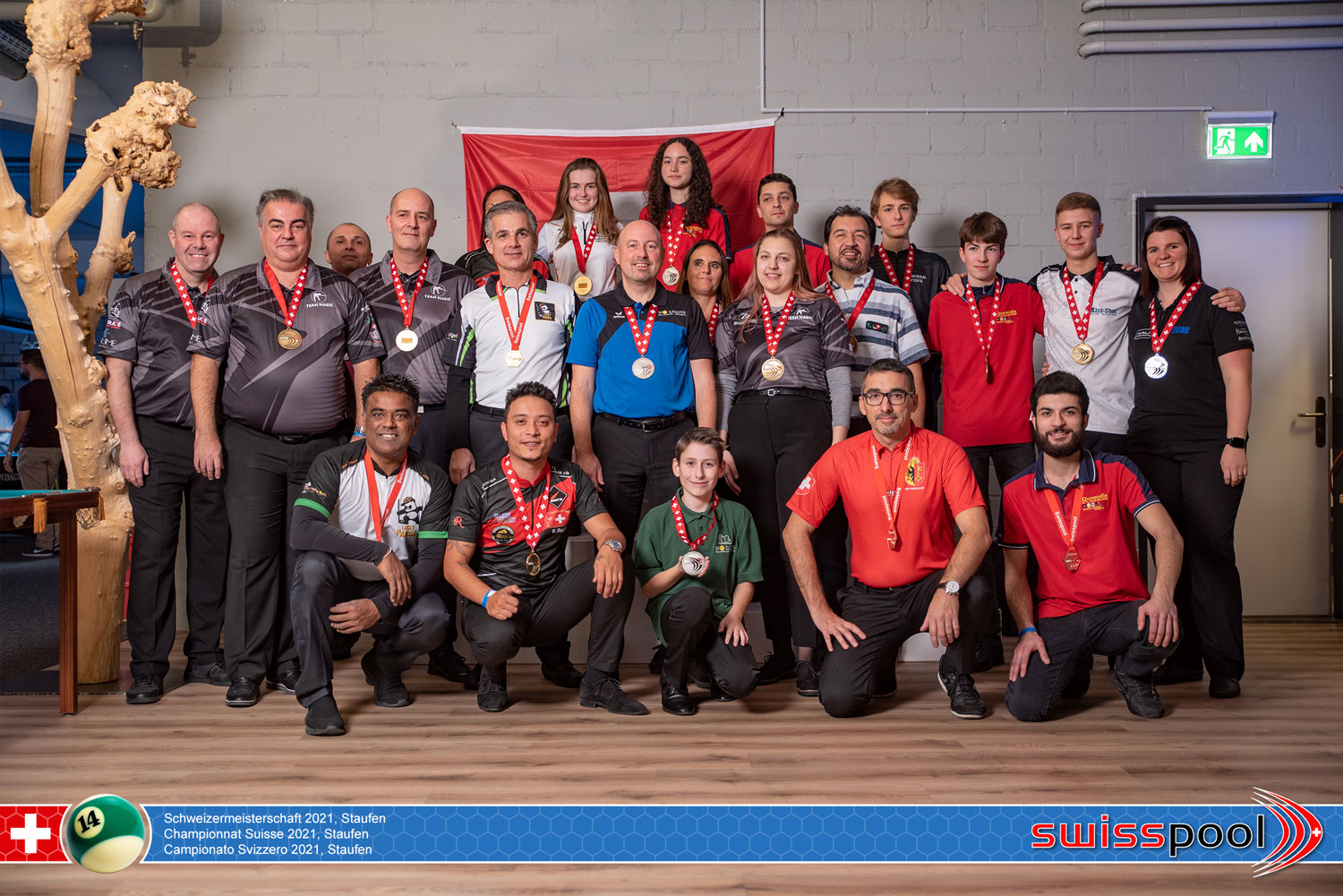 Nach einem Jahr Corona-Pause durften die Finalspiele der Schweizermeisterschaften im Pool-Billard endlich wieder stattfinden. Los ging es am Freitagabend, 19. November, um Punkt 17.00 Uhr im grössten Billard-Center der Schweiz, dem Billard & Snooker Center Kiss-Shot in Staufen. An zehn Tischen starteten gleichzeitig die 14-1-Partien in den fünf verschiedenen Kategorien Damen, Elite, Promotion, Senioren und Jugend. Ab den Finalspielen spielten zusätzlich die Mädchen um die Goldmedaille in der Disziplin 14-1.